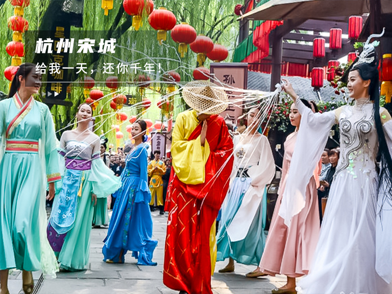 杭州宋城旅游景区位于西湖风景区西南,是中国的宋文化主题公园。景区内的雪月街、风花巷、过眼街、烟云街、往事街,让你珍惜当下、拥抱每一次的风花雪月;宋城门、珍宝楼、天空树、时光树、相思树、云梯漫步、空中花园、天空之城、演艺广场等一步一景,穿越时空;徜徉在华灯街,看宋阁、情桥、廊桥、骑士桥与宋河交相辉映,美不胜收;在森林剧院偶遇莎翁,在悬崖剧院与风齐鸣。杭州宋城演艺王国,老少同乐,晴雨皆宜,是一个集演艺、旅游、度假于一体的网红打卡地。