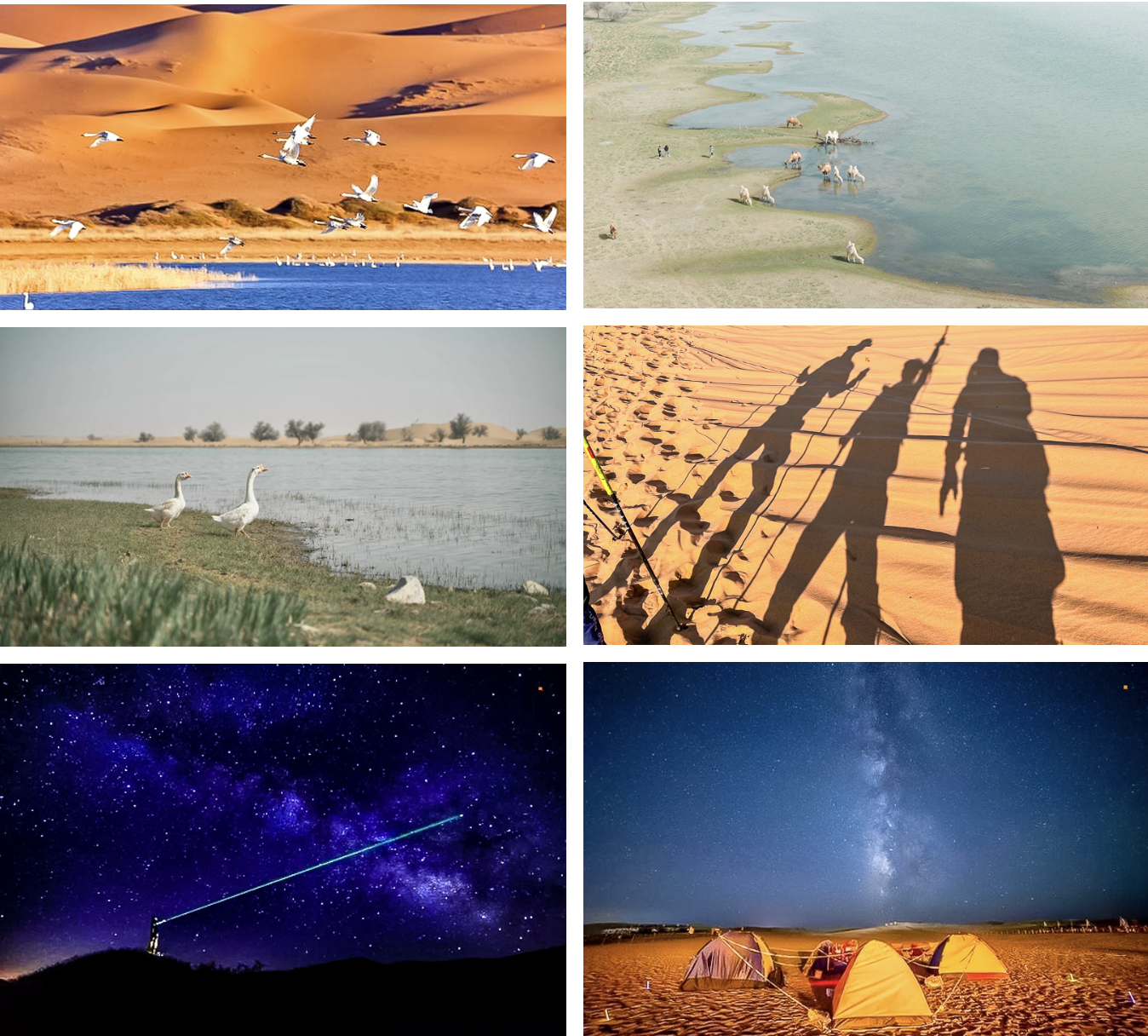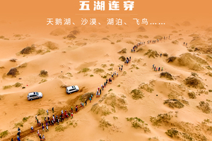 徒步过程中会经过大小不等5个湖泊,有淡水湖也有咸水湖,恍如世外桃源。每年3月和11月的水鸟迁徙季节会有大量珍惜水鸟停留腾格里沙漠;每年5-6月沙枣花开,离很远就能被沙枣花的香味唤醒;每年5-6月,湖边大片马兰花盛开呈现给你一个沙漠的春天。
