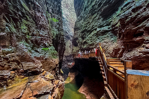 我们乘坐观光车-游船码头-峡谷爱心步行2公里-索道下站--索道山顶-玉皇宫-可坐空中巴士到达天空之城-天空之城电梯到达山底,全程需要5-6小时。有以下看点:1八泉峡的水色彩多变,下船至索道一处一景,水的深浅与光影的强弱都会影响水的色彩,非常漂亮;2爱心山谷是属于八泉峡特有的浪漫;3乘坐索道,欣赏山的壮美与辽阔,最美的山景尽收眼底。